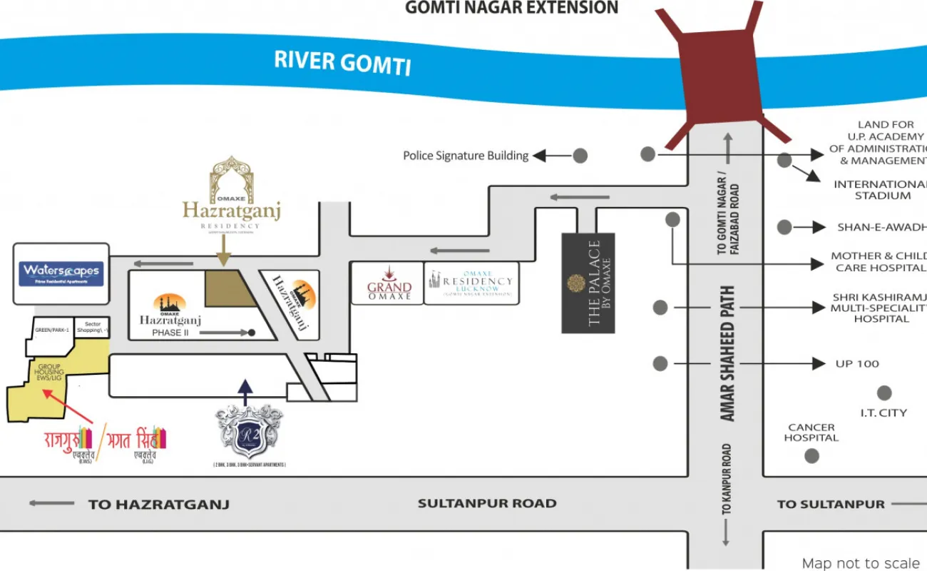 Welcome to Omaxe Hazratganj Residency, a luxurious residential project located in the heart of Gomti Nagar, Lucknow. This premium project is situated amidst the bustling and vibrant city life, yet it offers serene and peaceful surroundings to its residents. The project lies at an easy distance of 0.825 km from Sultanpur Road and 2.2 km from Shaheed Path, making it an ideal location for those who want to stay connected to the city ' s vibrant life.